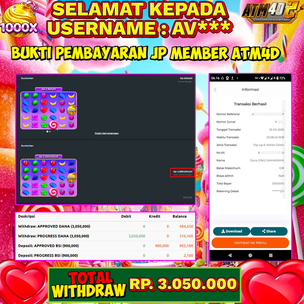 ATM4D2 dikenal sebagai situs terpercaya yang selalu menghadirkan pengalaman bermain slot online yang aman, fair, dan berlisensi resmi. Di sini, kami tidak hanya sekadar memberikan janji, tapi bukti nyata berupa slip kemenangan yang dapat Anda lihat secara langsung.