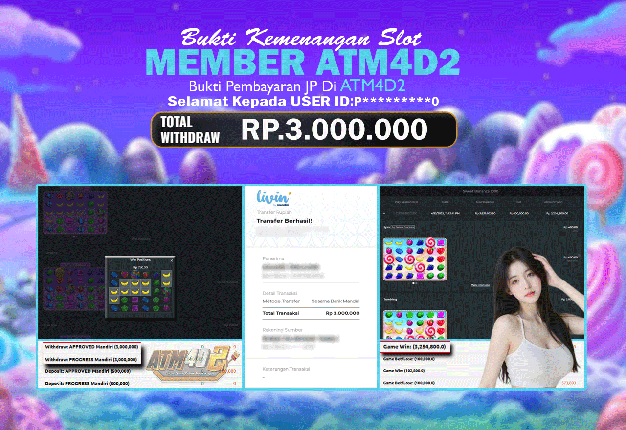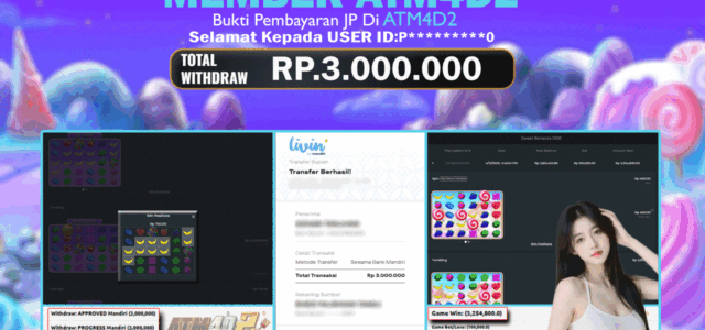 ATM4D2 dikenal sebagai situs terpercaya yang selalu menghadirkan pengalaman bermain slot online yang aman, fair, dan berlisensi resmi. Di sini, kami tidak hanya sekadar memberikan janji, tapi bukti nyata berupa slip kemenangan yang dapat Anda lihat secara langsung.