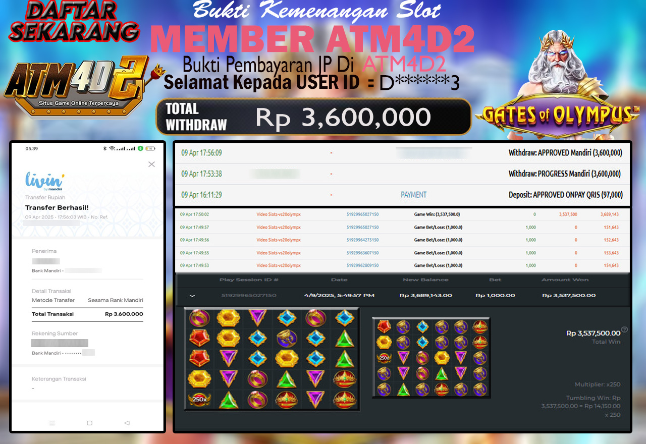 ATM4D2 dikenal sebagai situs terpercaya yang selalu menghadirkan pengalaman bermain slot online yang aman, fair, dan berlisensi resmi. Di sini, kami tidak hanya sekadar memberikan janji, tapi bukti nyata berupa slip kemenangan yang dapat Anda lihat secara langsung.