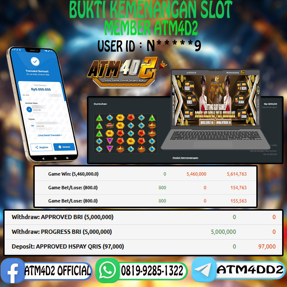 ATM4D2 dikenal sebagai situs terpercaya yang selalu menghadirkan pengalaman bermain slot online yang aman, fair, dan berlisensi resmi. Di sini, kami tidak hanya sekadar memberikan janji, tapi bukti nyata berupa slip kemenangan yang dapat Anda lihat secara langsung.
