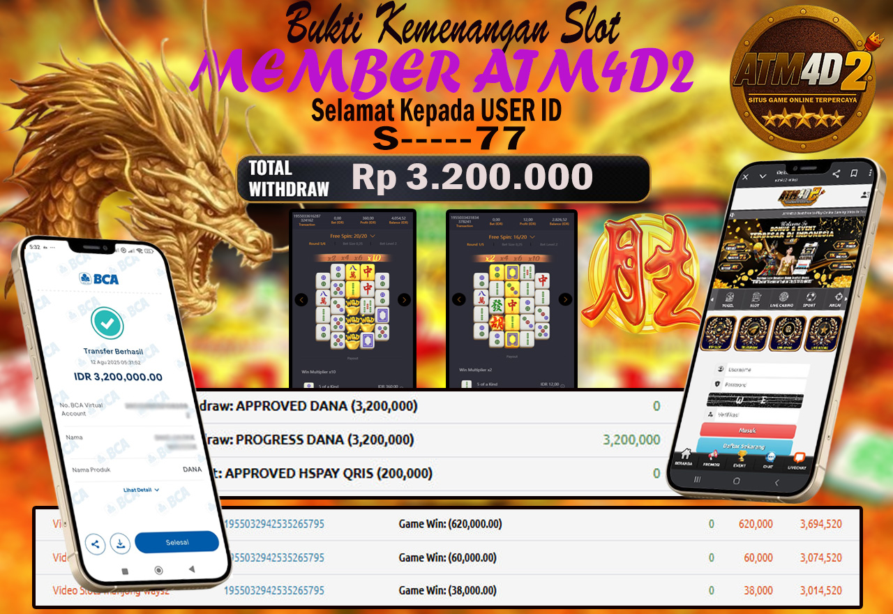 ATM4D2 dikenal sebagai situs terpercaya yang selalu menghadirkan pengalaman bermain slot online yang aman, fair, dan berlisensi resmi. Di sini, kami tidak hanya sekadar memberikan janji, tapi bukti nyata berupa slip kemenangan yang dapat Anda lihat secara langsung.