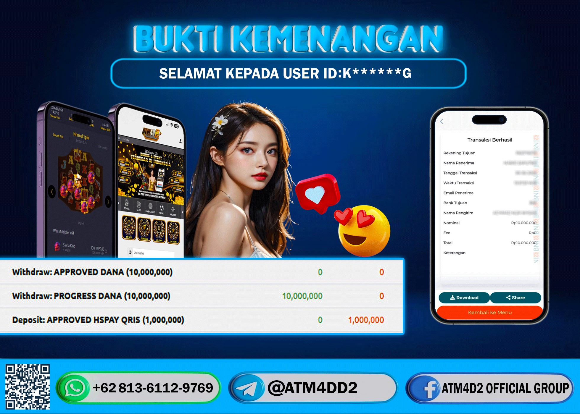 ATM4D2 dikenal sebagai situs terpercaya yang selalu menghadirkan pengalaman bermain slot online yang aman, fair, dan berlisensi resmi. Di sini, kami tidak hanya sekadar memberikan janji, tapi bukti nyata berupa slip kemenangan yang dapat Anda lihat secara langsung.